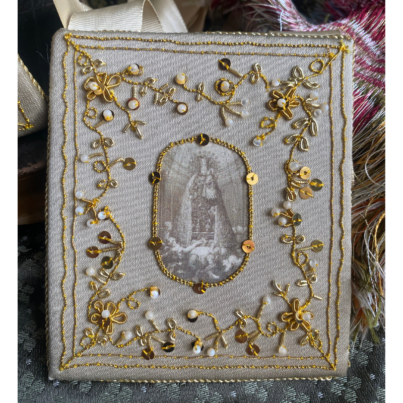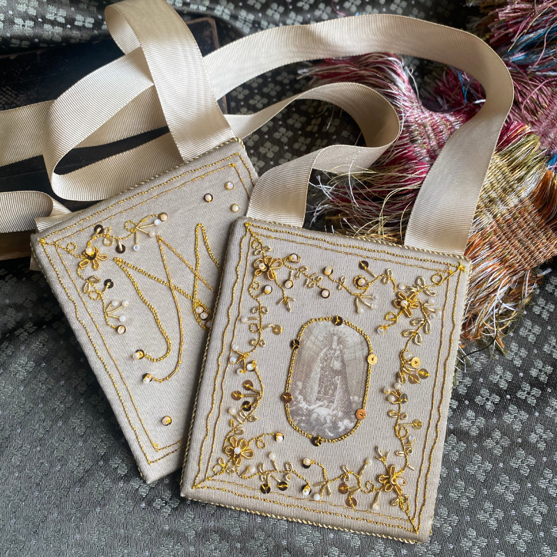 Bordado artesanalmente a mano sobre raso de seda: en una de sus piezas un delicado bordado floral envuelve una preciosa imagen de la Virgen de los Desamparados, en la otra pieza el símbolo de María.