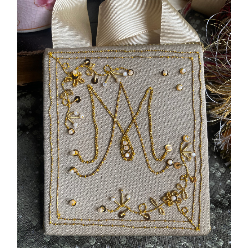 Bordado a mano sobre raso de seda natural de nuestro color Latte con metal oro, mostacillas de nácar y lentejuelas.