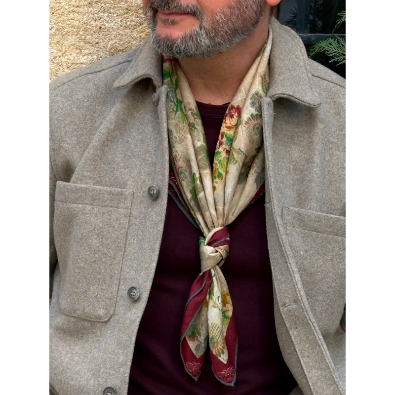 Pañuelo estampado en gasa de seda natural 100% de 8mm; tamaño 90×90 cm, orilla hecha a mano.