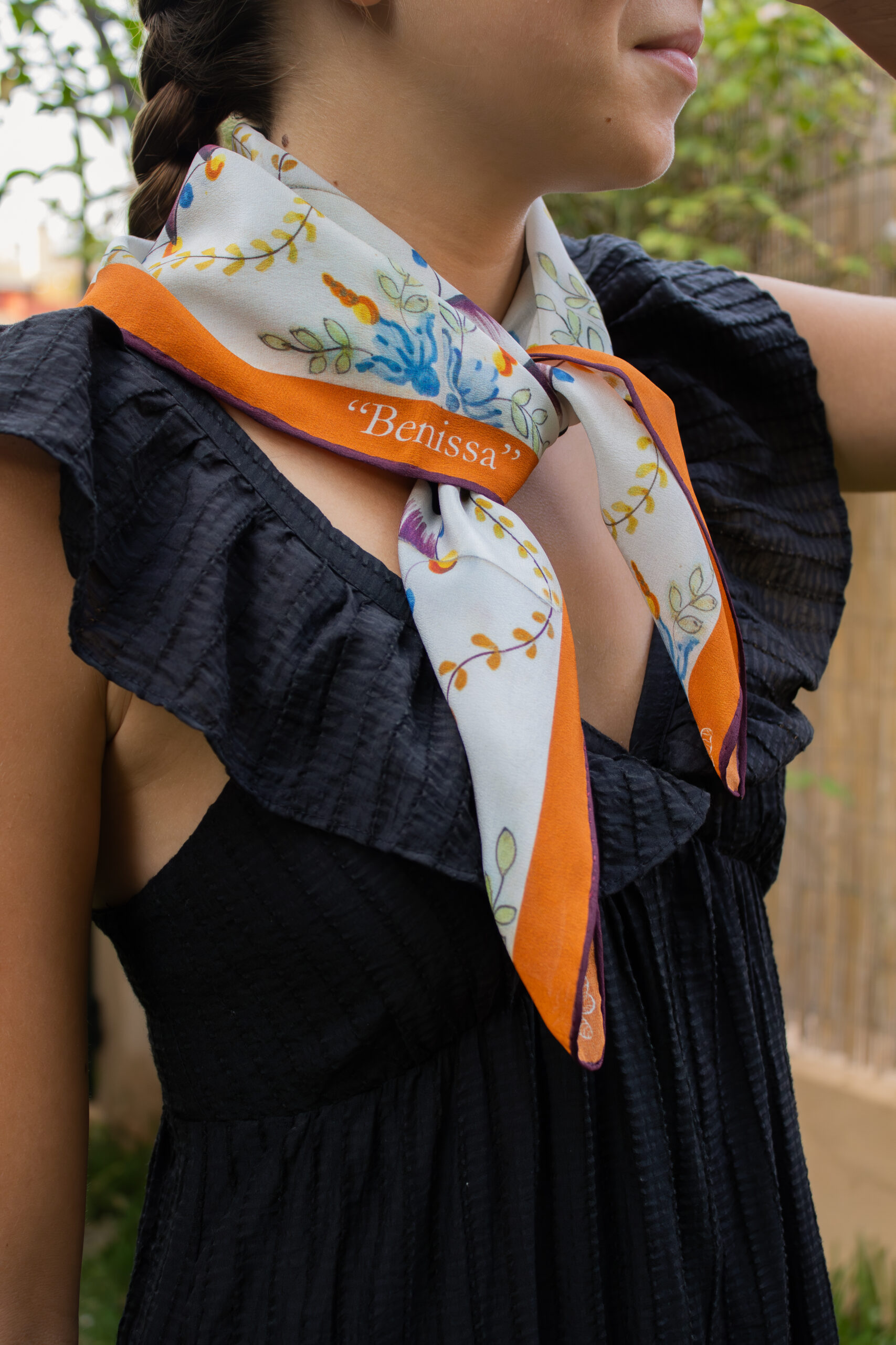 Pañuelo estampado en gasa seda natural 100% de 10 mm, tamaño 90×90, orilla hecha a mano.