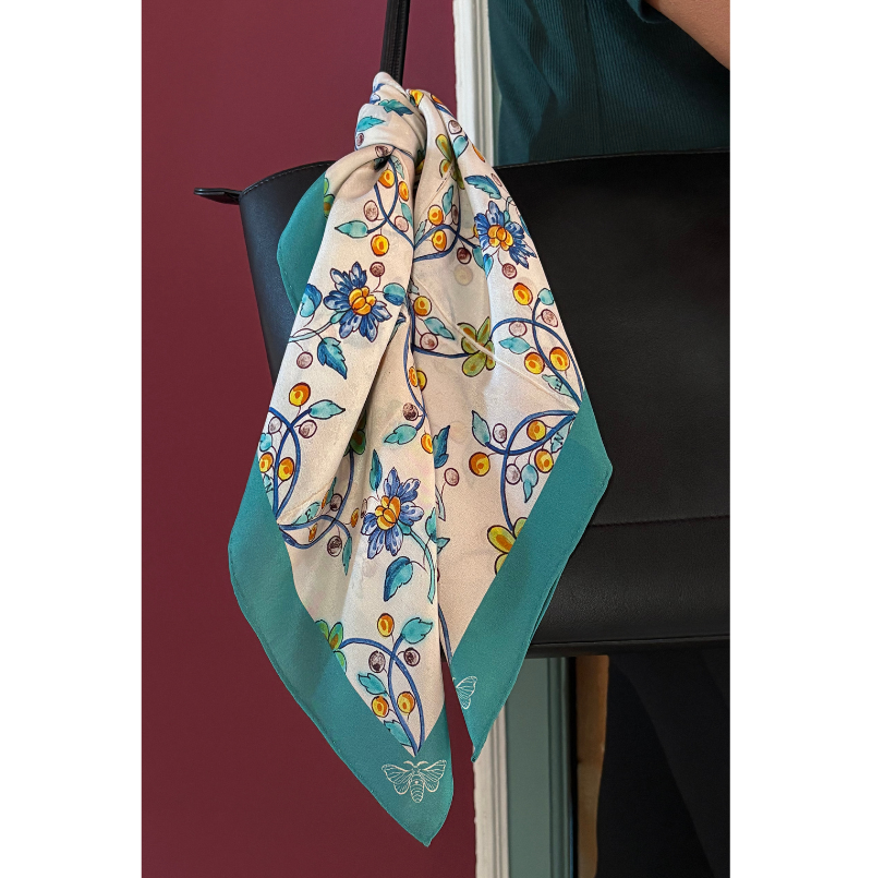 Pañuelo estampado en crepe de seda natural 100% de 12mm; un tejido mate, suave con caída media y ligeramente elástico. Diseñado en Valencia y orillado a mano.