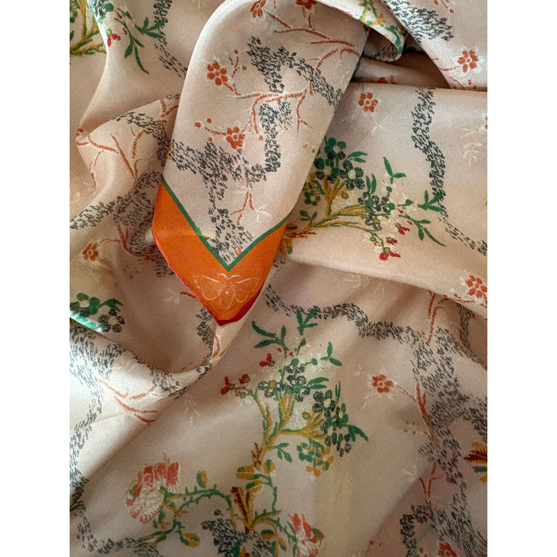 Pañuelo estampado en gasa de seda natural 100% de 8mm; tamaño 90×90 cm, orilla hecha a mano.