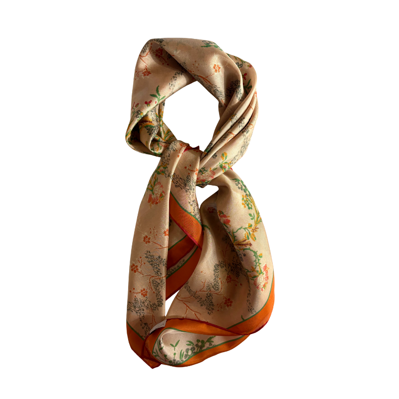 Pañuelo estampado en gasa de seda natural 100% de 8mm; un tejido suave con brillo y caída ligeros. Diseñado en Valencia y orillado a mano.