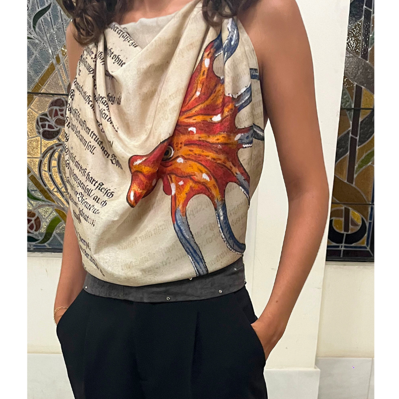 Pañuelo estampado en gasa de seda natural 100% de 10mm; tamaño 90×90 cm, orilla hecha a mano.