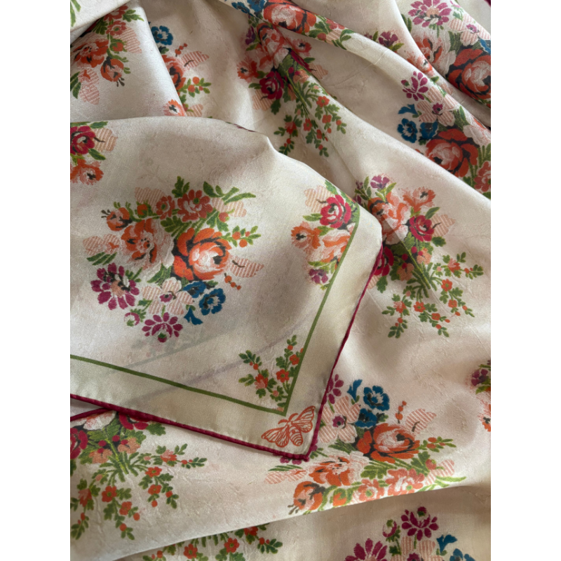 Pañuelo estampado en gasa de seda natural 100% de 8mm; tamaño 90×90 cm, orilla hecha a mano.