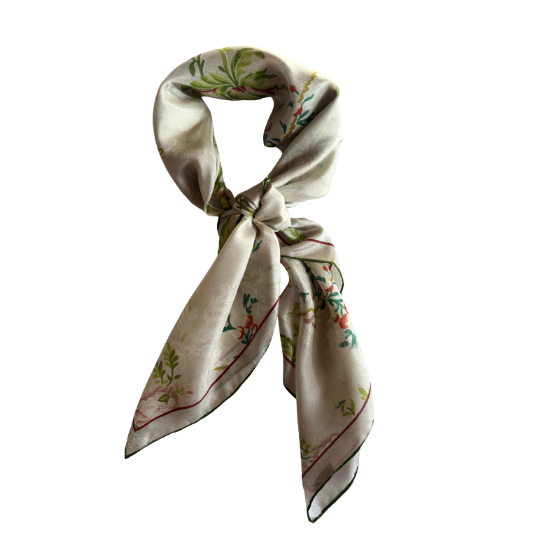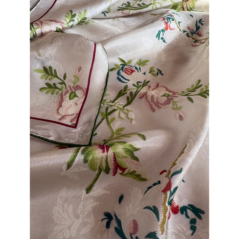 Pañuelo estampado en gasa de seda natural 100% de 8mm; tamaño 90×90 cm, orilla hecha a mano.